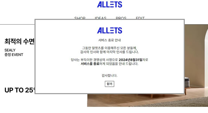 18일 유통업계에 따르면 알렛츠는 지난 16일 홈페이지에 ‘부득이한 경영상 사정으로 8월 31일 자로 서비스를 종료하게 되었음을 안내드린다’는 공지문을 게시했다.