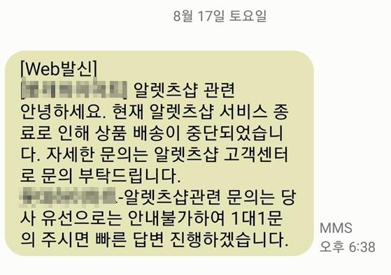 알렛츠 서비스 종료에 따른 배송중단 문자. [사진 출처 = 연합뉴스] 상품 주문 후 배송 중단을 통보받은 고객들은 카드 결제 취소 등 신속한 환불을 촉구하고 있다. 알렛츠 입점 판매자들의 경우 16일이 중간 정산일이었는데 지급이 이뤄지지 않았다며 미정산대금이 수백억원에 이를 수 있다는 주장이다.