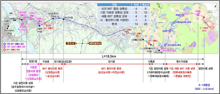 세종∼공주 광역 BRT는 공주시 종합터미널에서 세종시 한별동까지 18.5㎞ 구간에 BRT 전용도로 구축,정류장 설치,교차로 교통체계 및 신호 운영체계 개선 등을 실시하는 사업이다. 오는 10월 착공해 2026년 상반기까지 완공할 계획이다. 총사업비는 218억3700만원이다.