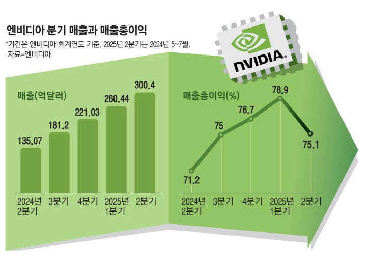 28일(현지시간) 엔비디아는 미국 주식시장이 끝난 뒤 2분기 실적을 발표했다. 엔비디아의 분기 주당순이익(EPS)은 68센트로 시장 예상치 64센트보다 높았고,매출도 300억4000만달러(약 40조원)로 예상치인 287억달러보다 높았다.