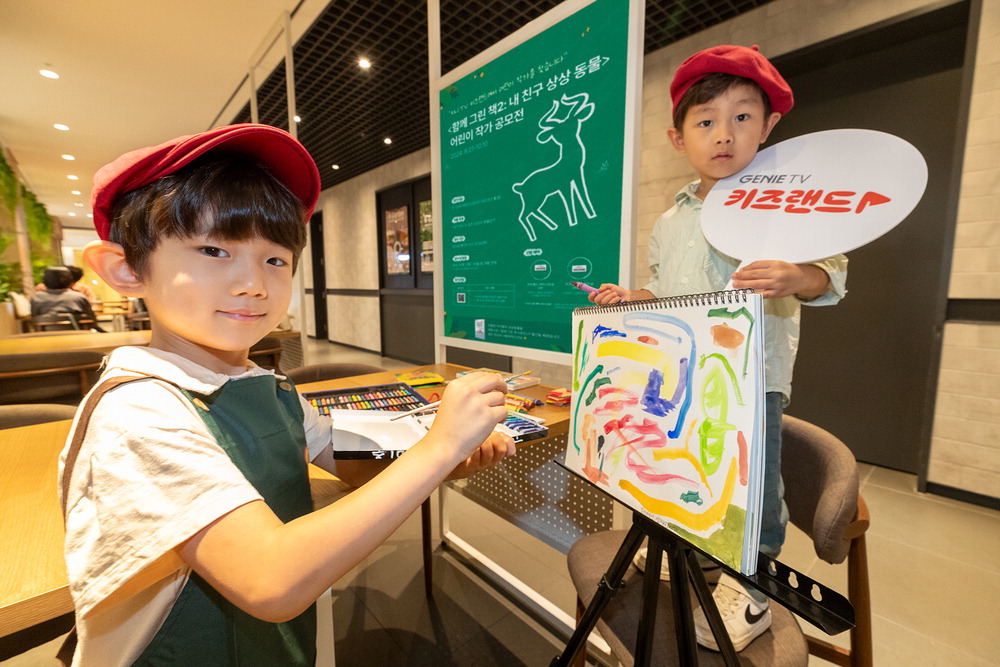 KT가 영유아 전용 IPTV 서비스인 지니TV 키즈랜드에서 어린이 작가 공모전을 진행한다고 5일 밝혔다. KT는 3~12세 어린이 작가를 선발해 '함께 그린 책 : 내 친구 상상 동물'이라는 그림책을 내년 초 출간할 예정이다. 사진은 KT 어린이 모델이 어린이 작가 공모전을 소개하는 모습. KT