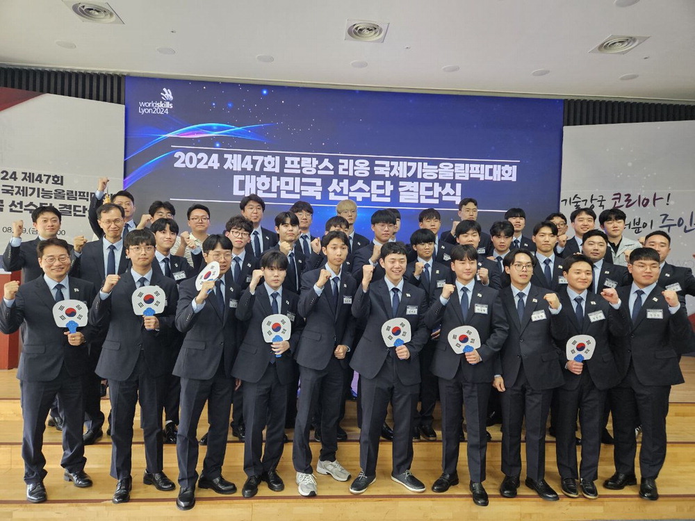 지난달 9일 리옹 국제기능올림픽 대한민국 선수단 결단식에서 삼성 소속 선수들과 코치진 및 심판진이 결의를 다지고 있다. 삼성전자