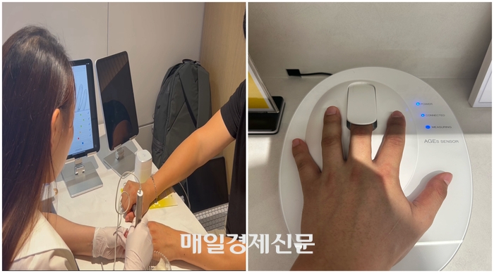 체성분·당독소·미량영양소·피부상태 등 종합적인 영양 상태를 4종의 전문 측정 기기를 통해 진단한다. [변덕호 기자] 검사는 전문적으로 진행된다. 개인 식습관 등에 대한 설문과 함께 체성분·당독소·미량영양소·피부상태 등 종합적인 영양 상태를 4종의 전문 측정 기기를 통해 진단한다.먼저 ‘AGEs sensor’라는 장비로 당독소 수치를 파악한다. 당독소란 포도당,과당과 같은 당이 단백질 또는 지방에 결합해 당화된 물질로 노화 시 증가한다.마그네슘,비오틴,셀레늄,엽산,아연,비타민 B1,비타민 B2,비타민 B6,비타민C,비타민 E 등 체내 부족한 영양소를 알려주는 ‘비타스틱’ 검사도 진행한다.체수분과 단백질,무기질,지방을 측정하는 인바디를 사용해 체형을 진단한다.이와 함께 평소 식습관을 진단하는 검사 설문도 병행한다.끝으로 네 가지 검사 결과를 종합해 ‘그리팅 헬스 스코어’를 매긴 후 이에 맞는 맞춤 솔루션을 제공한다.