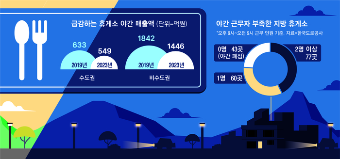 실제 한국도로공사에 따르면 고속도로 휴게소의 야간 매출은 확연히 줄어들고 있다. 특히 비수도권 휴게소에서 더 두드러진다. 수도권 휴게소의 경우 밤 9시부터 다음달 아침 9시까지 매출액이 2019년 633억원에서 지난해 549억원으로 13.2% 감소했지만,비수도권 휴게소는 같은 기간 1842억원에서 1446억원으로 21.5%나 줄었다.