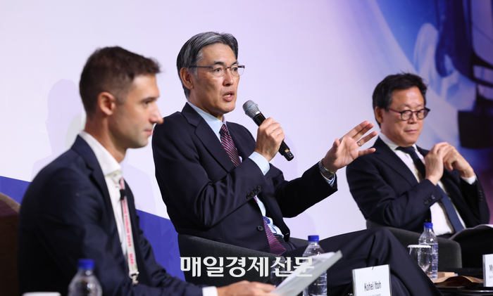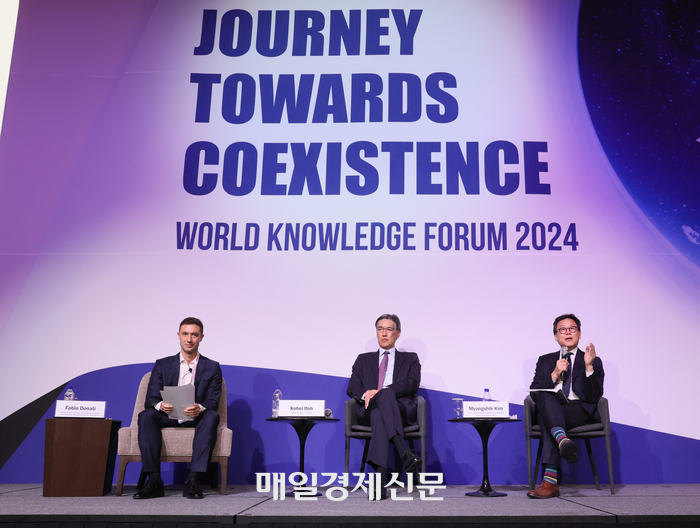 11일 열린 세계지식포럼 ‘게임체인저를 꿈꾸는 양자컴퓨터’ 세션에서 이토 코헤이(가운데) 일본 게이오대 총장이 양자컴퓨터 미래에 대해 설명하고 있다. 좌장 역할을 맡은 파비오 도나티(왼쪽) 기초과학연구원(IBS) 양자나노과학 연구단 연구위원과 김명식 영국 임페리얼칼리지런던 물리학과 교수. 이충우 기자 양자컴퓨터는 실현 가능성이 없는 ‘파랑새’인가,인류의 기술 혁신을 이끌 ‘꿈의 컴퓨터’인가.