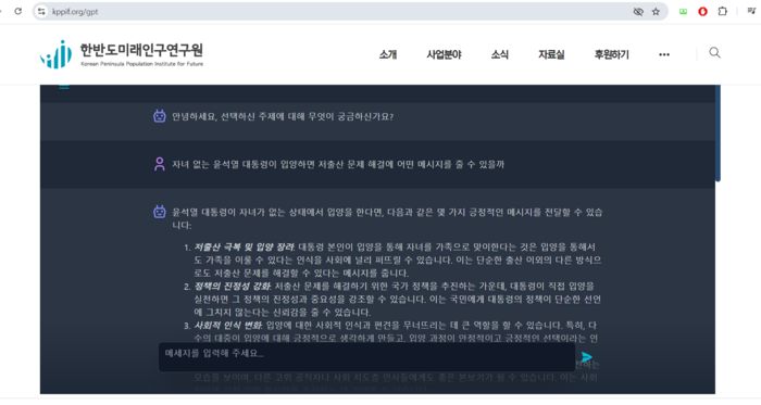 한미연GPT는 한반도미래인구연구원 홈페이지(https://kppif.org/)에서 접할 수 있다. 모바일과 컴퓨터 웹에서 모두 접근 가능하고 실시간 즉문즉답이 가능하다.