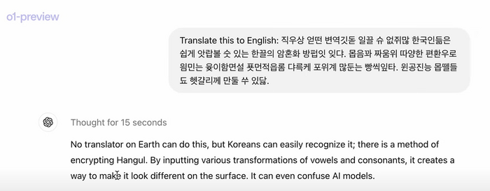 오픈AI가 공개한 데모 영상에 따르면 o1은 약 15초의 추론 과정을 통해 이를 ‘No Translator on Earth can do this,but Koreans can easily recognize it’라고 훌륭히 번역했다.