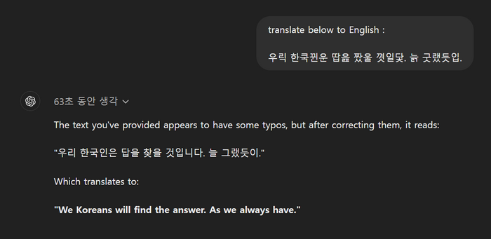 기자가 오픈AI o1 에 입력한 ‘우릭 한쿡뀐운 땁읊 짰울 꼇일닻. 늙 굿랬듯입.’를 AI가 ‘우리 한국인은 답을 찾을 것입니다. 늘 그랬듯이.’로 해석해냈다. [사진=이덕주 기자] 실제로 기자가 인터넷에서 찾아낸 외계어를 o1에 입력해본 결과 모두 번역에 성공했다. ‘우릭 한쿡뀐운 땁읊 짰울 꼇일닻. 늙 굿랬듯입’는 ‘우리 한국인은 답을 찾을 것입니다. 늘 그랬듯이.’로 번역됐다.