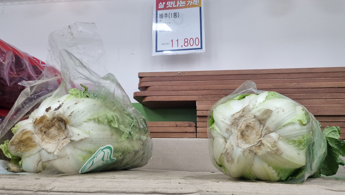 올여름 기록적인 폭염과 폭우 등으로 인해 여름 배추 가격이 폭등한 가운데 20일 서울의 한 대형마트에 김장용 배추가 한포기에 11,900원에 판매되고 있다. 2024.9.20 [이승환 기자] 추석이 지나도록 이어진 폭염에 배추 가격이 포기당 1만원에 육박했다. 정부의 추석 민생안정 대책 효과가 사라지기 무섭게 배추 가격이 급등한 것이다. 올해 밥상물가 급등세가 이어지는 가운데 11월 김장철까지 주재료인 배추와 무 가격이 안정되기 어려울 것이란 우려가 나오면서 소비자들의 시름도 깊어지고 있다.
