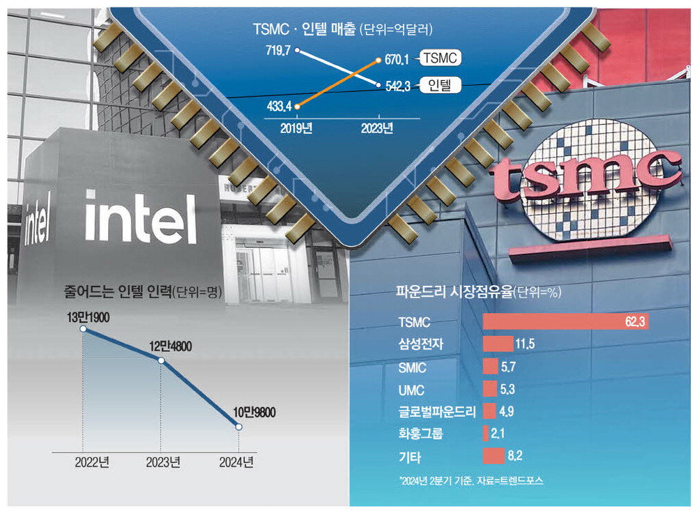 오늘날 명암이 엇갈린 두 기업은 태생 면에서 유사했다. 인텔은 1968년 실리콘밸리의 대표 반도체 기업인 페어차일드 출신 로버트 노이스와 고든 무어가 창업했다. 노이스는 직접 회로를 발명한 엔지니어였고,무어는 마이크로칩에 저장할 수 있는 데이터 분량이 18~24개월마다 두 배씩 증가한다는 '무어의 법칙'을 발견한 반도체 선구자였다. 이들은 메모리 반도체 시장을 장악한 뒤 한국·일본 기업이 부상하자 중앙처리장치(CPU)로 눈을 돌려 오늘날 인텔을 '반도체 제왕'의 반석에 올려놓은 인물이다. TSMC는 텍사스 인스트루먼트 출신의 모리스 창이 1987년에 창업한 반도체 제조 전문 기업이다. 당시 그는 메모리 시장이 한국·미국·일본 기업이 장악해 이미 공고해진 것을 보고 제조에만 집중하기로 결정했다. 파운드리 산업의 태동이다.