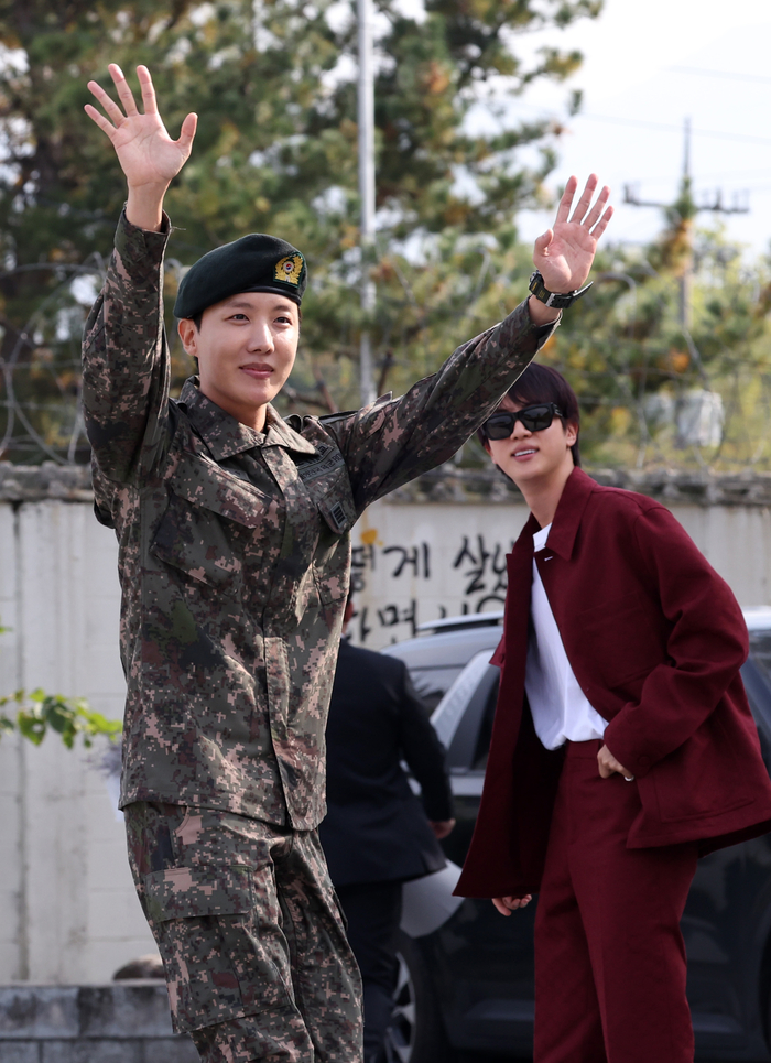 세계적 K팝 그룹 방탄소년단(BTS)의 멤버 제이홉(30·본명 정호석)이 17일 만기 제대했다. 지난 6월 먼저 전역한 맏형 진이 마중 나와 커다란 꽃다발을 안겼다. 내년 6월 제대 예정인 다른 멤버 5명은 이날 나오지 않았지만,진은 취재진을 대신해 제이홉 앞에서 무릎을 꿇고 마이크를 받쳐주는 등 호쾌한 환영 인사로 눈길을 끌었다.
