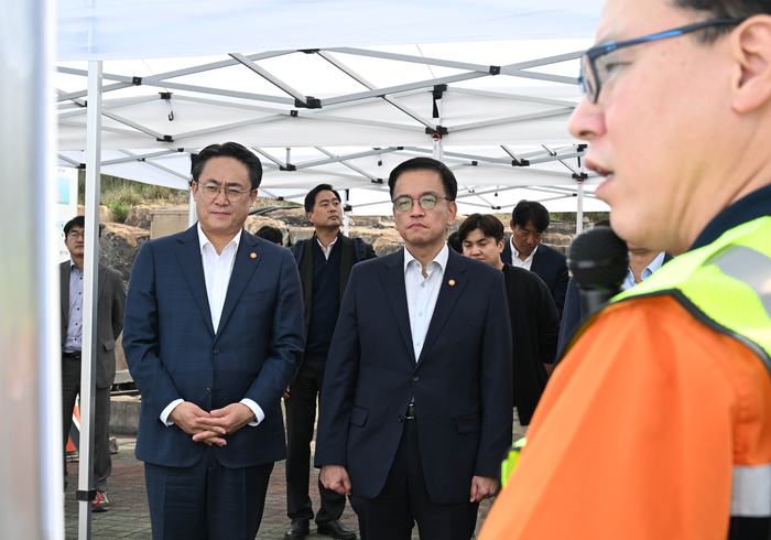 최상목 부총리 겸 기획재정부 장관(오른쪽)이 10월 17일 오후 포스코 포항제철소를 방문해 수소환원제철 매립예정부지에서 강도형 해수부 장관과 함께 관계자의 설명을 듣고 있다. [사진=기획재정부]