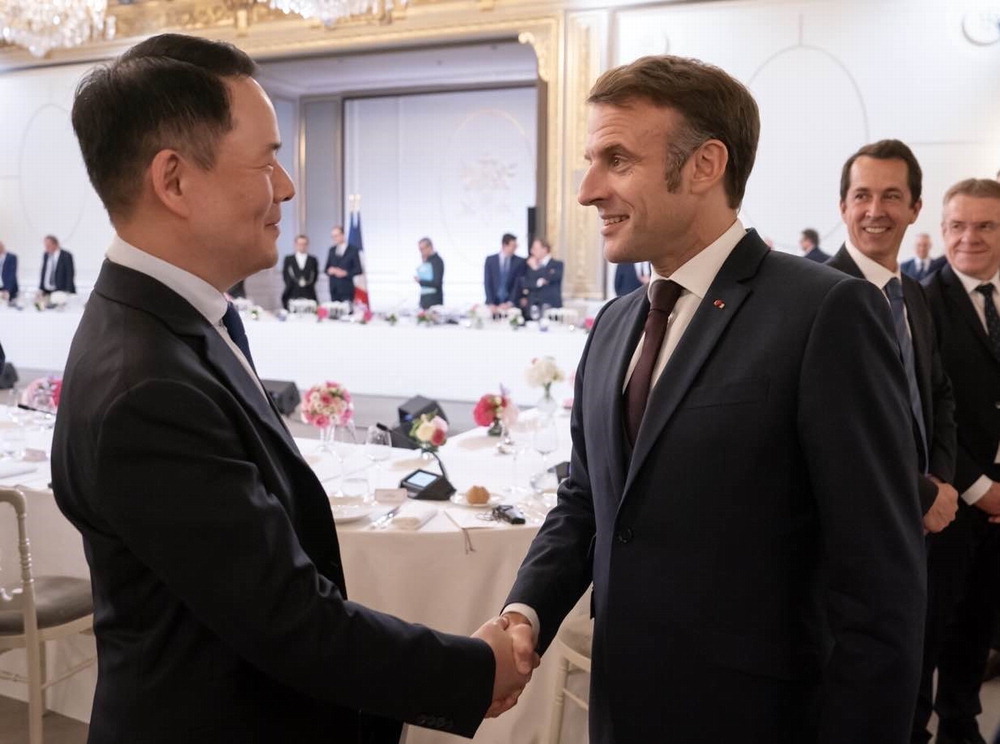 21일(현지시간) 열린 세계 기업인 만찬에서 마크롱 대통령(오른쪽)과 허진수 파리바게뜨 사장이 악수하고 있다. 엘리제궁 제공
