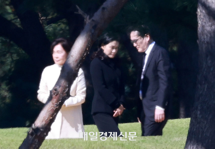 25일 오전 11시 고 이건희 삼성그룹 선대회장 가족들이 경기도 수원시 이목동에 위치한 선영에서 열린 이 선대회장 4주기 추도식에 참석하고 있다. 왼쪽부터 홍라희 전 리움미술관장,이서현 삼성물산 사장,이재용 삼성전자 회장. 이승환 기자 ‘삼성 위기론’ 속에서 고(故) 이건희 선대회장의 4주기 추모식이 25일 오전 경기 수원 선영에서 열렸다. 이재용 삼성전자 회장과 삼성그룹 경영진은 선영을 찾아 고인을 기렸다.