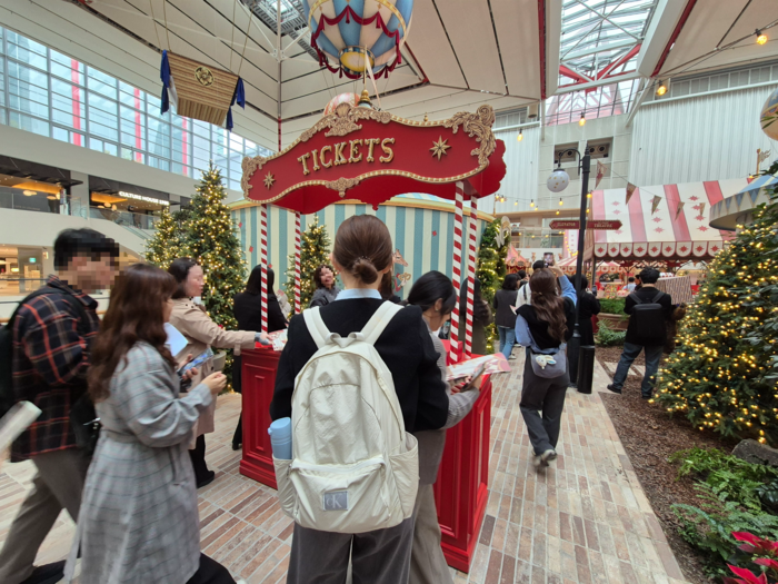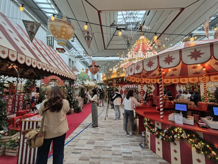 더현대서울 크리스마스 연출.[사진=김현정 기자] 티켓 부스를 거쳐 서둘러 입구로 들어서니 1만여개 조명으로 장식된 11채의 서커스 극장이 마술처럼 펼쳐졌다. 다채로운 색상의 천막을 하나씩 들어가보는 재미가 쏠쏠했다.