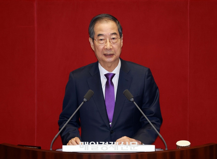 한덕수 국무총리가 4일 국회에서 열린 본회의에서 윤석열 대통령을 대신해 2025년도 예산안 및 기금운용계획안에 대한 시정연설문을 대독하고 있다. [김호영 기자] 정부는 올해 본 예산보다 3.2% 늘어난 677조원 규모의 내년도 예산안을 국회에 제출했다. 윤 대통령은 “재정사업 전반의 타당성과 효과성을 재검증해 총 24조원의 지출 구조조정을 단행했다”며 “이를 통해 약자복지,미래대비 투자 등 국가가 해야 할 일에 집중적으로 투입했다”고 설명했다.