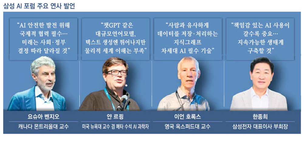 삼성전자는 이달 4~5일 이틀간 딥러닝 분야 세계적 권위자 요슈아 벤지오 캐나다 몬트리올대 교수,얀 르쾽 미국 뉴욕대 교수 겸 메타 수석 AI 과학자,이언 호록스 영국 옥스퍼드대 교수를 비롯한 글로벌 AI 석학을 초청해 '삼성 AI 포럼 2024'를 개최했다. 온라인으로 참여한 르쾽 교수를 제외하고 모든 석학이 한국을 직접 찾아 강연에 나섰다.