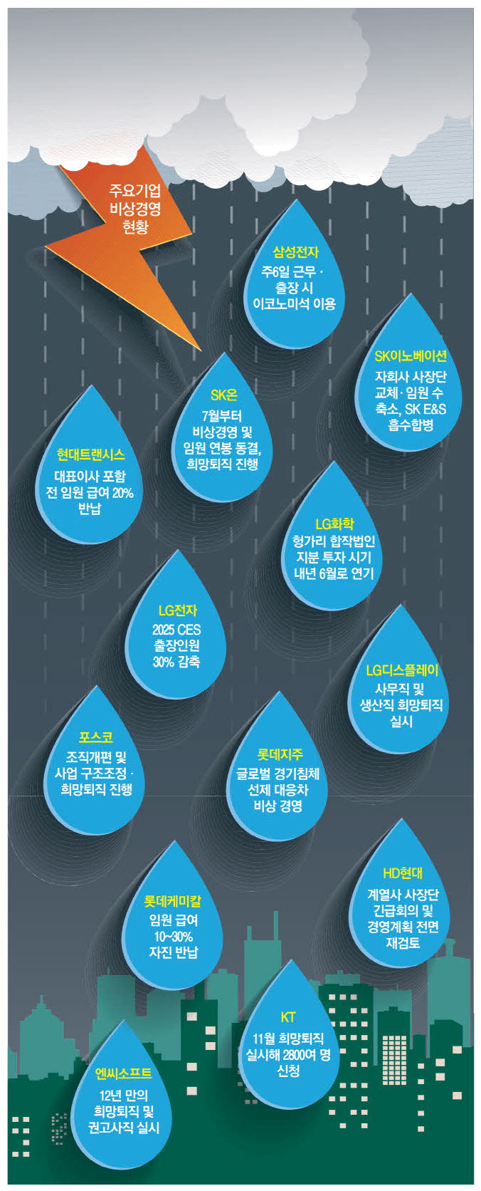 재계가 이처럼 대대적인 비상 경영에 돌입한 것은 실적부진과 불확실성 때문이다. 올해 3분기 물류비 상승에 따른 실적부진이 4분기까지 이어지는 가운데 도널드 트럼프 2기 행정부 출범으로 대미 수출 불확실성까지 커졌다. 기업별로 임원 승진 최소화와 임금 반납,조직 슬림화,경비 절감,희망퇴직이 줄지어 확산되고 있다. 내년 경기 전망도 어둡다. 내년에 편성할 일반 예산까지 올해보다 대폭 삭감하는 분위기다.