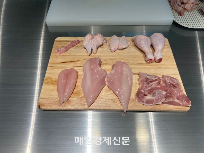 식힌 닭 한 마리를 발골. [변덕호 기자] 이렇게 식힌 닭 한 마리를 직접 부위별로 발골하는 과정도 살펴볼 수 있었다. 하림 관계자는 안심,가슴살,다리,날개,목뼈 등을 발골해 차례대로 선보였다.끝으로 하림 관계자는 “해외 식품 기업들이 우리나라로 들어오고 있는데 경쟁력을 갖춰야 하지 않겠는가. 식품의 맛과 퀄리티를 높이는 게 가장 큰 경쟁력”이라며 “맛있는 음식을 만들기 위해서는 신선한 재료로 신속하게 고객의 식탁 위에 올려야 한다”고 재차 강조했다.