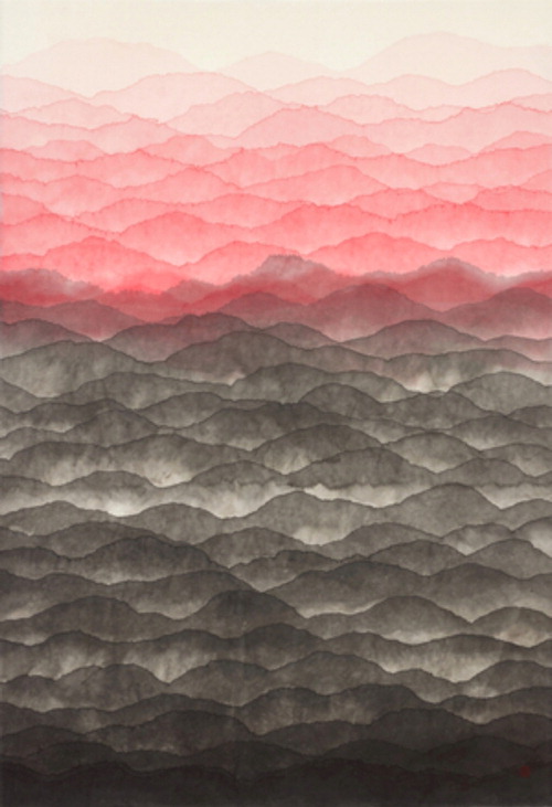 번지듯 뻗어나간 곡선들은 바다 물결인지,산등성이인지 경계가 모호하고 노을 진 풍경처럼 윗부분은 붉은빛이다. 전통 수묵화의 현대적 재해석으로 국제적인 명성을 쌓아온 김민정 작가(62)의 'Mountain(산)'(2022)이다. 어둠에서 출발해 밝은 빛에 이르기까지 점진적인 형태로 채워진 화면은 심연 깊숙한 명상의 세계로 안내한다.