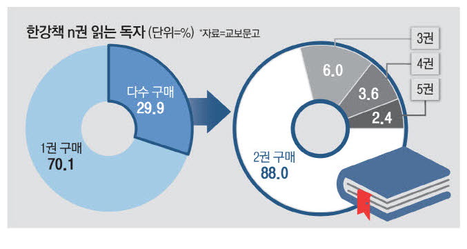 18일 교보문고에 따르면 한강 작가의 도서를 구매한 회원 가운데 2권 이상 구매한 비율이 29.9%로 집계됐다. 지난달 10일부터 이달 12일까지 집계했고,반품과 비회원 구매는 제외했다. 한강의 책을 구매한 10명 가운데 3명은 이미 한강의 책을 여러 권째 사서 읽고 있는 셈이다. 대부분 한강의 책을 2권 구매한 것으로 나타났다. 한강의 책을 다수 구매한 독자 가운데 2권이 88.0%,3권 6.0%,4권 3.6%,5권 이상은 2.4%로 집계됐다.