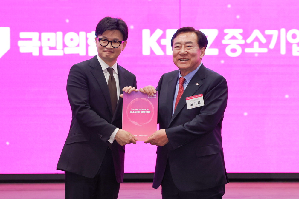 18일 국민의힘·중소기업인 간담회에서 한동훈 국민의힘 대표(왼쪽)가 김기문 중소기업중앙회장으로부터 중소기업 정책과제 45건을 전달받고 있다. 중소기업중앙회