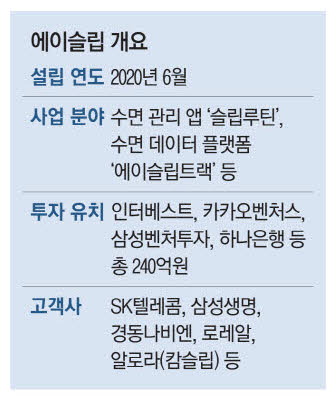 에이슬립은 사람의 호흡 소리를 통해 수면을 분석하고 숙면을 돕는 슬립테크 기업이다. 숨소리와 수면 질의 상관관계 연구에 4년간 200억원 넘게 투자하며 세계 최상위 기술력을 보유한 것으로 평가받는다. 2022년 미국 스탠퍼드대 의대 수면센터와 분당서울대병원의 공동 연구에 따르면 에이슬립 앱의 수면 측정 정확도는 애플의 '애플워치8',삼성의 '갤럭시워치5'보다 높았다. 인터베스트,카카오벤처스,삼성벤처투자,하나은행을 비롯한 투자자로부터 240억원을 유치했다. 지난달에는 2020년 창사 이후 월간 EBITDA(이자·세금·감가상각 전 순이익) 기준 첫 흑자 전환을 달성했다.