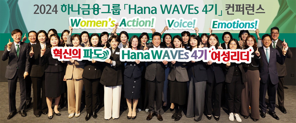 함영주 하나금융그룹 회장(가운데)이 지난 25일 서울 중구 하나은행 본점에서 열린 여성 리더 육성 프로그램 '2024년 하나 웨이브스 컨퍼런스'에서 그룹 경영진 및 여성 지도자들과 기념촬영을 하고 있다. 하나금융그룹