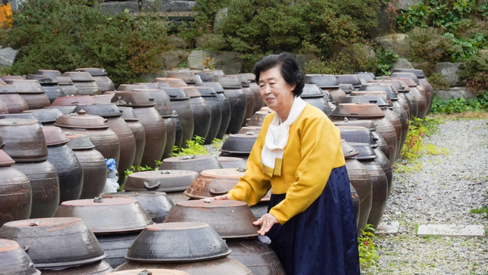 고려전통식품 마당의 옹기/사진=류한나래 여행+ PD 고려전통식품의 마당에는 1200여 개의 옹기가 오와 열을 맞춰 늘어선 장관이 펼쳐진다. 52년 동안 장을 만들어온 기 명인의 세월이 고스란히 느껴진다. 이곳에서 숙성된 간장은 숙성 기간에 따라 청장(1년 미만),중간장(3~5년),진장(5년 이상)으로 나뉜다. 기 명인이 칠흑처럼 검은 진장이 담긴 옹기를 열어 그 맛을 직접 보여준다.