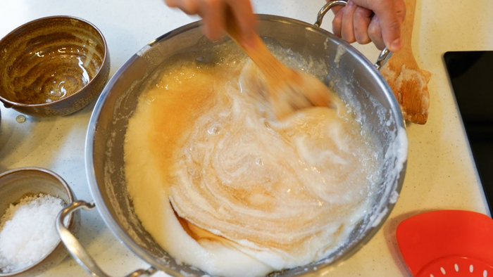 고추장이 만들어지는 과정/사진=류한나래 여행+ PD 고춧가루를 넣기 전까지는 아리송하던 표정의 참가자들이 고춧가루를 넣고 나서야 “아!” 하고 웃는다. 그전까지는 묽던 혼합물이 고춧가루의 성분으로 점성이 생겨 비로소 고추장의 모습을 띄기 때문이다. 고추장은 숙성 환경에 따라 맛이 쉽게 변해 만든 고추장을 집에 가져가진 못하지만 참가자들에게는 강 명인이 만든 고추장을 제공한다.