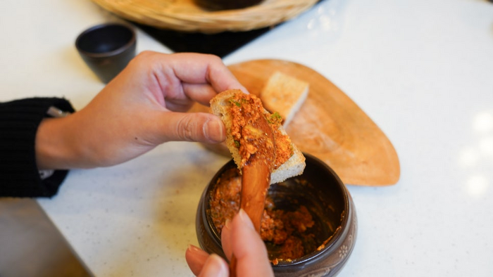 빵에 발라 먹는 고추장 버터/사진=류한나래 여행+ PD 말로 들었을 때는 상상이 가지 않던 고추장 버터를 실제로 먹어보니 예상보다 맵지 않고 고소한 맛이 일품이다. 채소나 쌈에 곁들여도 좋지만 바싹하게 구운 빵에 발라 먹으면 어디서도 맛 본 적 없는 새로운 맛을 경험할 수 있다. 계량에 따라 맛이 달라져 다른 참가자와 고추장 버터의 맛을 비교하는 재미도 쏠쏠하다.