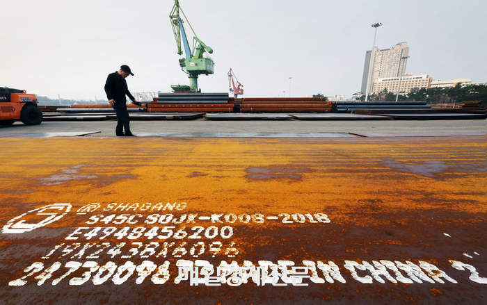 중국산 철강재의 주요 수입로인 인천항에서 2일 한 물류 담당자가 ‘메이드 인 차이나(MADE IN CHINA)’라는 글귀가 적힌 중국산 후판을 살펴보고 있다.2024.12.02[이충우기자]