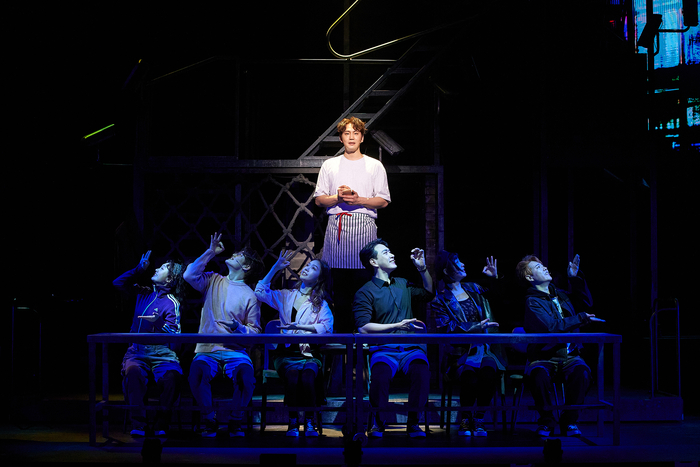 뮤지컬 ‘틱틱붐’에서 존(장지후)이 식당 아르바이트를 하며 노래 부르고 있다 <신시컴퍼니>