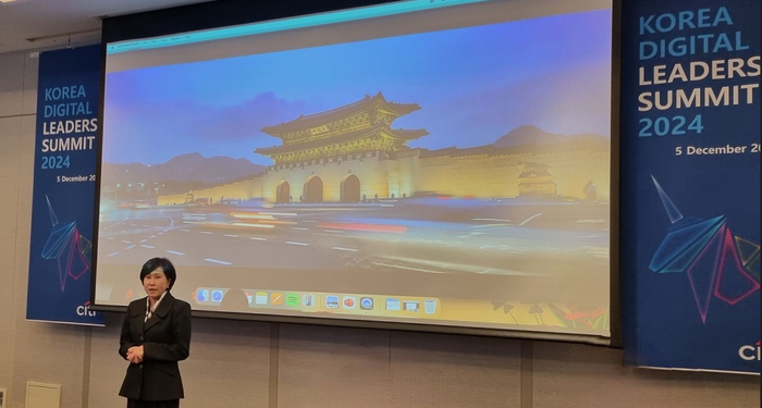 5일 서울 강남구 그랜드 인터컨티넨탈 서울 파르나스에서 열린 ‘코리아 디지털 리더스 서밋 2024’에서 유명순 한국씨티은행장이 인사하고 있다. [한국씨티은행]