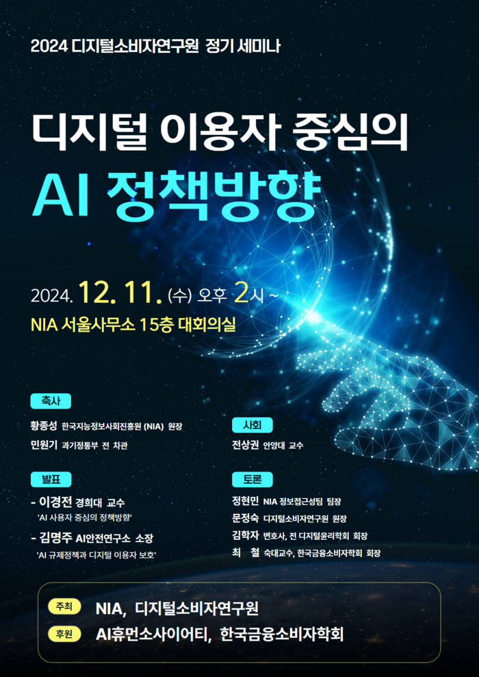 디지털 소비자 연구원은 “이번 세미나는 사용자 권리와 사회 복지를 중심으로 AI 정책을 형성하는 데 필요한 귀중한 통찰력을 제공할 것”이라고 했다.