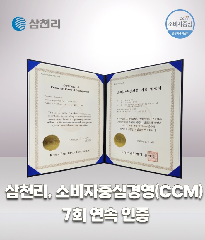 도시가스 기업 삼천리는 ‘소비자 중심 경영(CCM·Customer Centered Management)’ 인증을 7회 연속 획득했다고 10일 밝혔다.