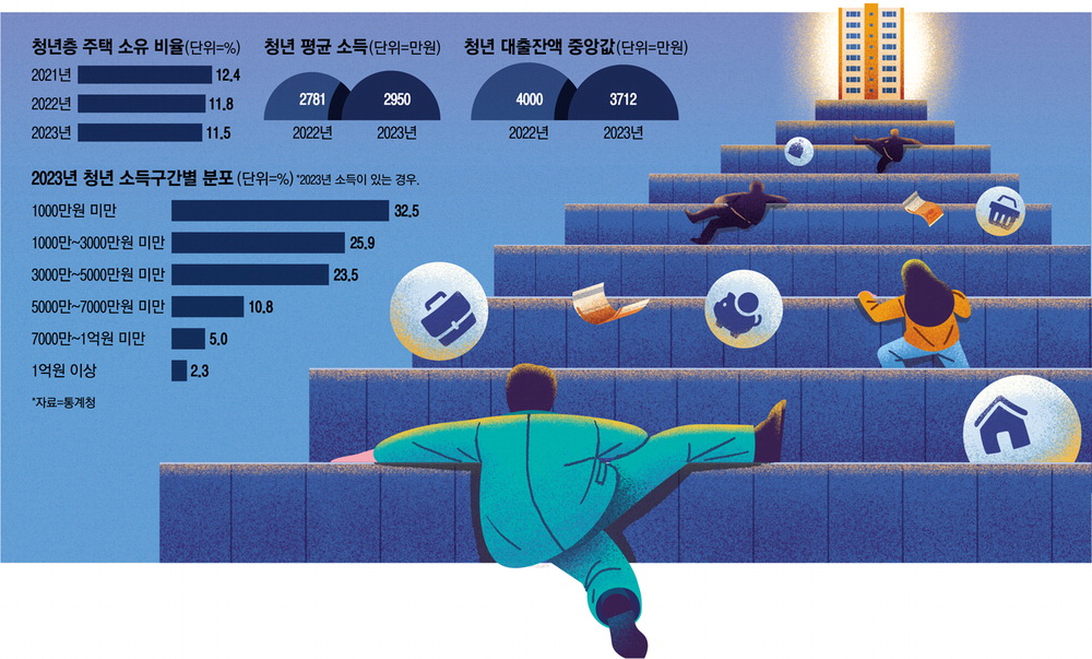 23일 통계청이 발표한 '2023년 생애단계별 행정통계'에서 드러난 청년층의 현실은 우울하기만 하다. 이 자료에 따르면 청년층(만 15~39세) 10명 중 1명만 주택을 소유한 것으로 나타났다. 평균소득은 3000만원에 못 미치지만 대출잔액은 3700만원이다. 청년층 취업자는 1년 만에 20만명 가까이 급감했다. 이번 통계에서 청년층 유주택자 비율은 11.5%인 것으로 조사됐다. 2020년 12.1%에서 2021년 12.4%로 올랐지만 2022년엔 11.8%,2023년 11.5%로 2년 연속 하락했다. 통계청 관계자는 "2021년은 코로나19 사태로 인한 저금리로 대출이 크게 늘어났다"며 "2023년에는 기준금리가 3.5%로 유지되면서 주택 소유 비중이 소폭 감소한 것으로 풀이된다"고 설명했다.