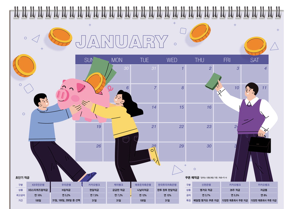 또 은행들은 특정 예적금 상품에 조건에 맞게 가입할 경우 편의점 등 다양한 쿠폰이나 포인트를 지급하는 행사를 진행한다. 은행 이벤트를 수시로 참고해 관련 행사에 참여할 수 있다. 카카오뱅크의 '26주 적금'은 26주 동안 매주 최초 가입 금액만큼 차주에 증액되는 금액을 납입하는 독특한 방식의 적금이다. 가입금액은 1000원부터 1만원 중 자유롭게 선택할 수 있다. 이 적금의 장점은 차곡차곡 목돈 모으기가 가능하다는 점도 있지만,외부 파트너사와의 연계를 통한 특화 상품을 선보였다는 것이다. 2020년 8월 이마트를 시작으로 유통,라이프스타일,콘텐츠,편의점 등 다양한 업계의 파트너사와 함께 파트너적금을 출시했는데,적금 납입에 성공할 때마다 파트너사의 쿠폰을 받아 활용할 수 있다. 카카오뱅크의 '저금통'도 1000원 미만의 동전을 모아주는 예금 상품이다. 신한은행의 '땡겨요 적금'은 배달앱을 자주 이용하는 고객 맞춤인 상품이다. 금리는 연 3.7%로 중간 수준이지만,신한은행 배달앱 '땡겨요' 2000원 할인 쿠폰을 최대 5장까지 받을 수 있기 때문에 해당 배달앱을 자주 이용하는 고객이라면 가입해볼 만한 상품이다. 단,쿠폰을 받기 위해선 적금 납입 미션을 성공해야 한다.
