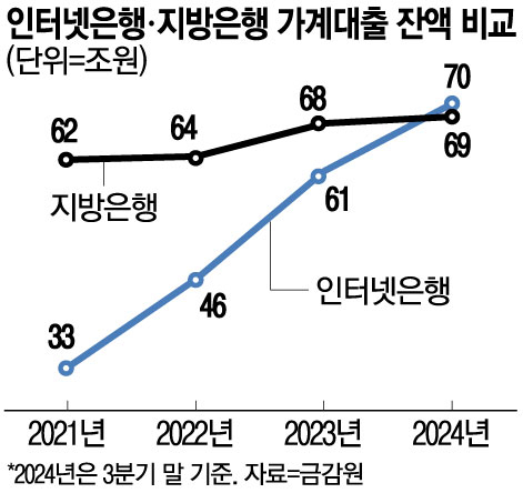 그 결과 인터넷은행 출범 초기인 2021년 3분기 31조2262억원에 불과했던 인터넷은행 3곳의 가계대출 잔액은 3년 새 37조원 가까이 불어났다. 반면 지방은행은 같은 기간 62조4645억원에서 7조원밖에 늘어나지 않았다. 지방은행의 가계대출 규모가 인터넷은행의 2배에 달했지만 3년 만에 추월당한 것이다.