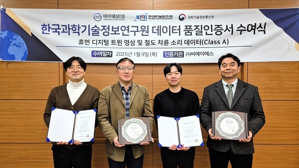 < 지난 1월 9일 씨에이에스 본사에서 진행된 DQ 인증서 수여식 / (왼쪽부터) 최지우 KISTI 국가과학기술데이터본부 책임기술원,심형섭 KISTI 국가과학기술데이터본부 책임기술원,백문기 KISTI 국가과학기술데이터본부 선임연구원,이승훈 씨에이에스 데이터·AI 인증센터 상무 > KISTI는 1962년에 설립된 과학기술 분야 정부출연연구기관으로,이번 연구를 포함하여 다양한 첨단 과학기술 연구를 선도해 왔다. 한편,‘AI 안전진단을 위한 소리 데이터’는 철도 차륜에서 발생하는 소음을 기반으로 문제를 감지하는 실시간 AI 솔루션 구축에 활용된다. ‘휴먼 디지털트윈 영상 데이터’는 다양한 임상 시뮬레이션을 수행할 수 있는 고정밀 인체 디지털트윈 구축에 활용된다.