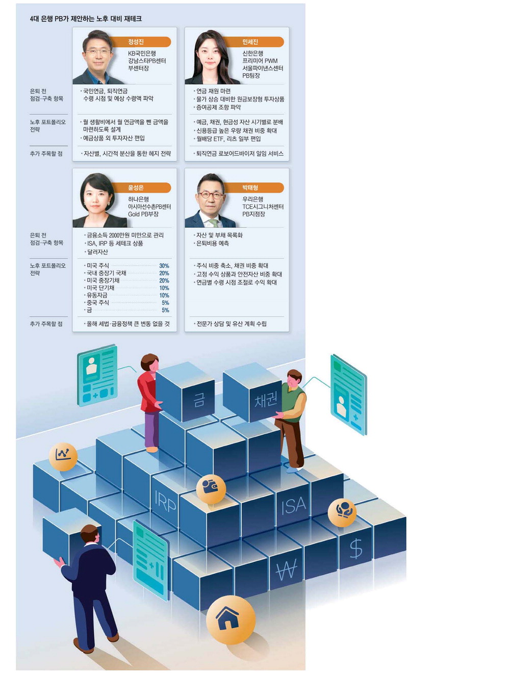 이제 은퇴 시점에 돌입하게 된 2차 베이비부머로서는 향후 은퇴자금을 어떻게 활용하는지가 더 중요해질 수밖에 없다. 이에 4대 은행(KB국민·신한·하나·우리은행)의 재테크 전문가들이 은퇴를 앞둔 이들에게 필요한 전략을 조언했다.