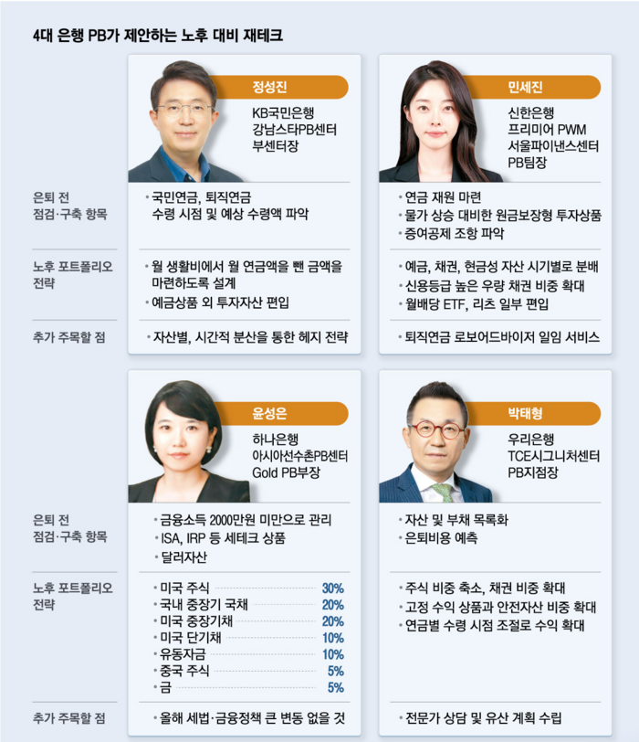프라이빗뱅커(PB)들은 현재 본인 상황을 파악했다면 향후 노후 생활에 맞게 포트폴리오를 재조정할 것을 주문했다.