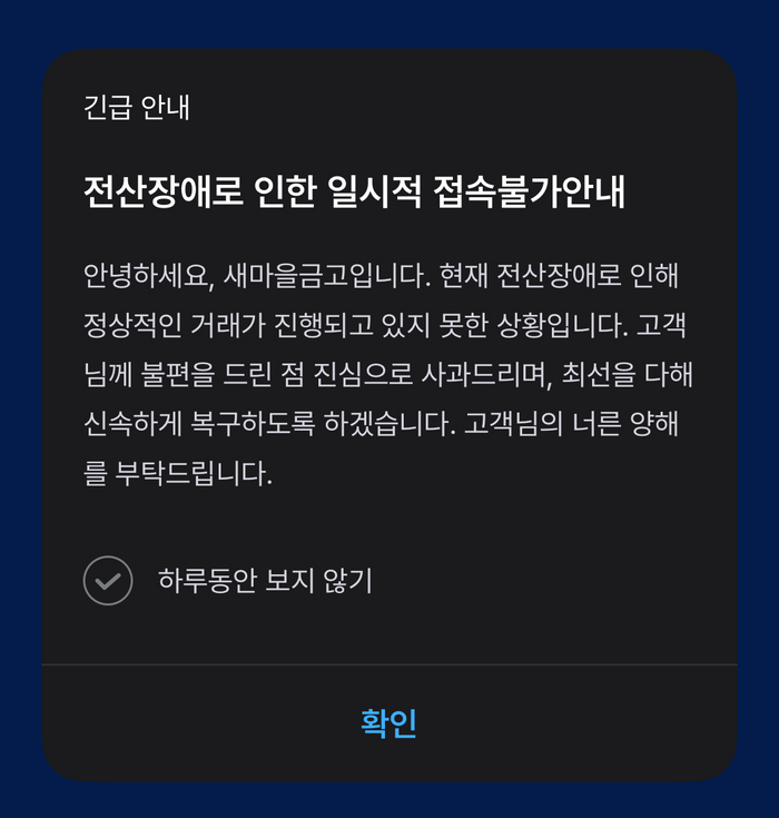 13일 새마을금고중앙회는 긴급 안내를 통해 “현재 전산장애로 인해 정상적인 거래가 진행되고 있지 못한 상황”이라며 “고객님께 불편을 드린 점 진심으로 사과드린다”고 밝혔다.