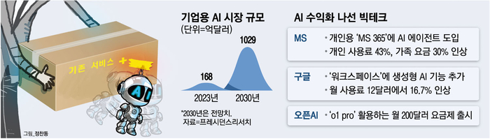 빅테크들의 요금 인상은 대규모 AI 투자 재원 마련 노력의 일환으로 해석된다. 블룸버그통신은 MS의 요금 인상과 관련해 “기존 고객 기반에서 더 많은 수익을 창출하기 위한 것”이라며 “고가의 AI 서비스를 개발하고 운영하는 데 수백억 달러를 지출하고 있는 것을 정당화하려는 시도”라고 해석했다. 로이터통신도 관련 기사에서 “MS는 오픈AI에 대한 투자와 이번 회계연도에 AI 인프라에 약 800억달러를 지출한다는 계획에 대한 성과 압박을 받고 있다”고 지적했다.