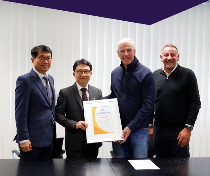 < 왼쪽부터 윈체 COO 정유형,대표이사 김형진,프로파인 회장 피터 모르직,CPO 스테판 쉐퍼 / 사진 제공 : 윈체 > ㈜윈체는 독일의 글로벌 창호 전문 기업 프로파인 그룹(Profine GMBH)과 전략적 협력관계를 구축하는 약정을 체결하며,국내 프리미엄 창호 시장 진출에 속도를 내게 되었다.