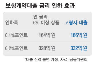 우선 보험계약대출 이율이 낮아진다. 보험계약대출은 보험금의 선급금 성격을 갖기 때문에 별도 대출 심사가 필요하지 않아 급전이 필요한 차주가 선호한다. 보험계약대출 잔액은 매년 늘어 지난해 말 71조7000억원에 달했다. 특히 3년 새 60대 이상 차주의 대출이 4조원 증가하는 등 고령자 비중이 높아지는 추세다.