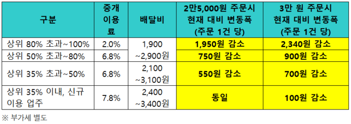 매출 상위 35% 이내는 7.8%(부가세 별도),상위 35% 초과∼80%는 6.8%를 적용한다. 80% 초과는 2%를 적용한다. 배달비는 1900∼3400원 사이다. 매출 상위 35% 이내는 배달비가 현재보다 높은 2400∼3400원이다. 상위 35% 초과∼50%는 2100∼3100원,상위 50% 초과는 1900∼2900원이다.