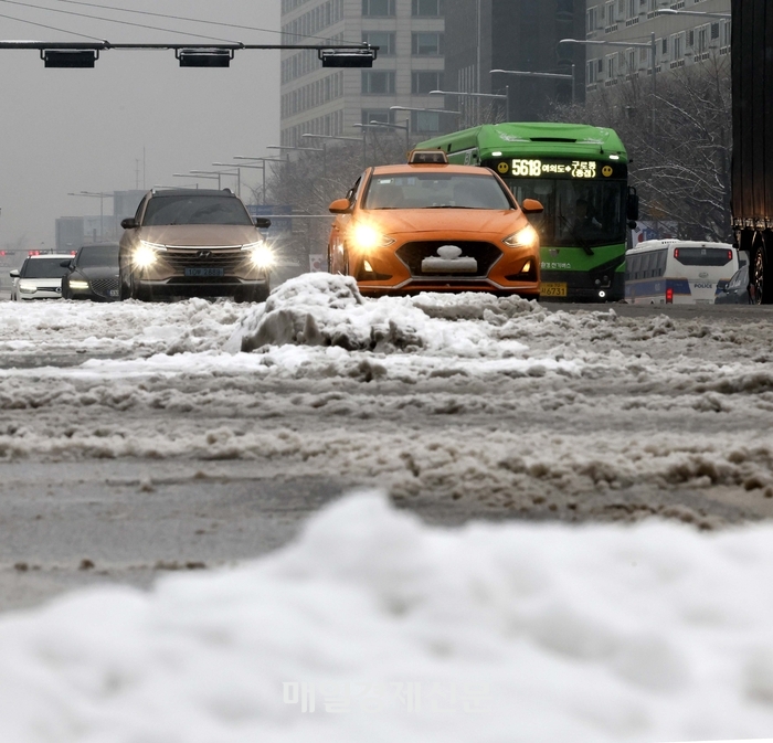 5일 서울 영등포구 여의도 일대 차로에 눈이 쌓여 차량들이 서행하고있다. <김호영 기자> 강추위 영향으로 이번달 들어 보름 동안 보험사들의 긴급출동 건수가 약 100만건 접수됐다. 이는 작년 같은 기간 대비 50% 넘게 증가한 수치다.