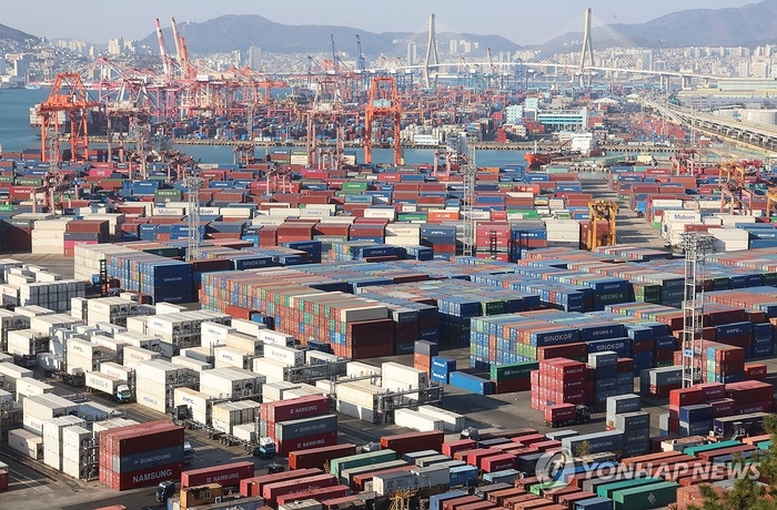 컨테이너 쌓인 부산항의 모습. [사진 출처 = 연합뉴스] 지난해 누적(1~12월) 경상수지는 990억4000만달러 흑자를 내면서 지난 2023년보다 3배 넘게 늘어났다.