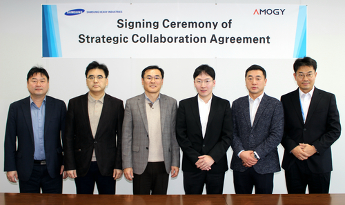 김경희 삼성중공업 부사장(왼쪽 세째)과 우성훈 아모지 대표(오른쪽 세째) 등이 전략적 협력 협정(SCA) 체결 후 기념 촬영을 하고 있다. [삼성중공업] 삼성중공업이 미국의 벤처기업 ‘아모지’와 암모니아 연료전지 개발을 위한 전략적 협정을 맺고 투자에 나선다고 7일 밝혔다. 삼성중공업은 액화천연가스(LNG) 이후 시대를 대비해 암모니아 생산부터 활용까지에 이르는 제품 개발을 서두르고 있다.